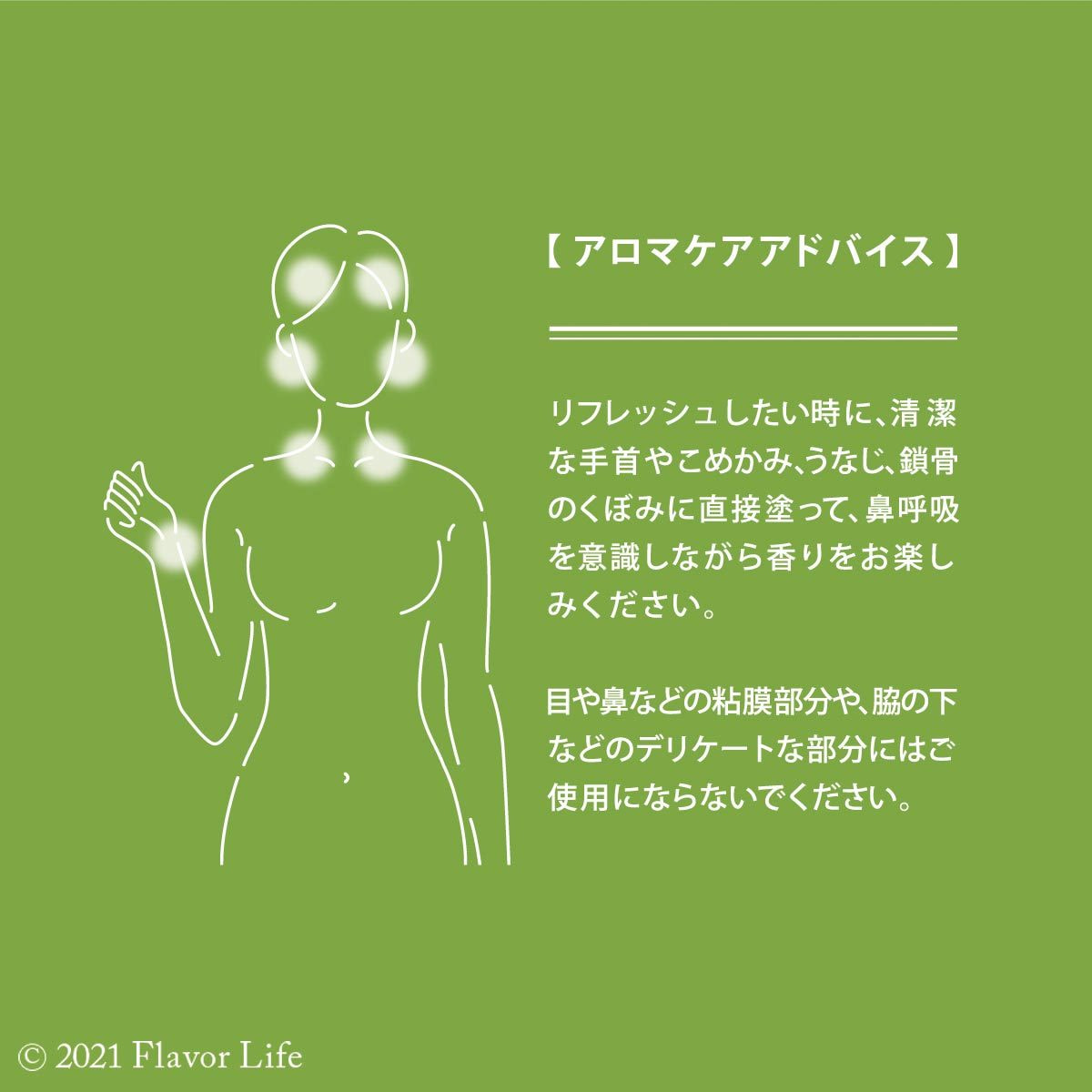 清潔な手首やこめかみ、うなじ、鎖骨のくぼみに直接塗って、鼻呼吸を意識しながら香りをお楽しみください。
